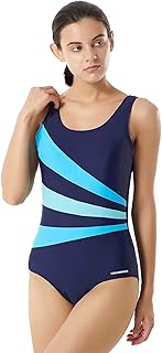 LULUWINGX Damen Einteiler Badeanzug mit DREI vorderen Splice Badeanzug tiefer U-Rücken Bademode Marineblau